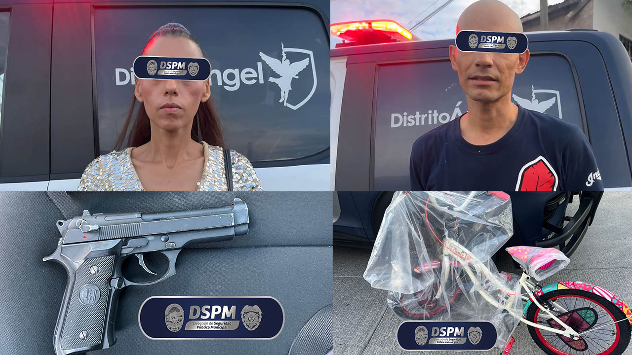 Chihuahua, Chih.- Mediante un recorrido ordinario que efectuaban agentes del Distrito Angel, turno 1, fue posible detectar una pareja en poder de un arma corta aparentemente de fuego y una bicicleta infantil, que tal vez fue sustraida de alguna vivienda cercana al lugar de la detención ocurrida en calles 55 y Rosales.