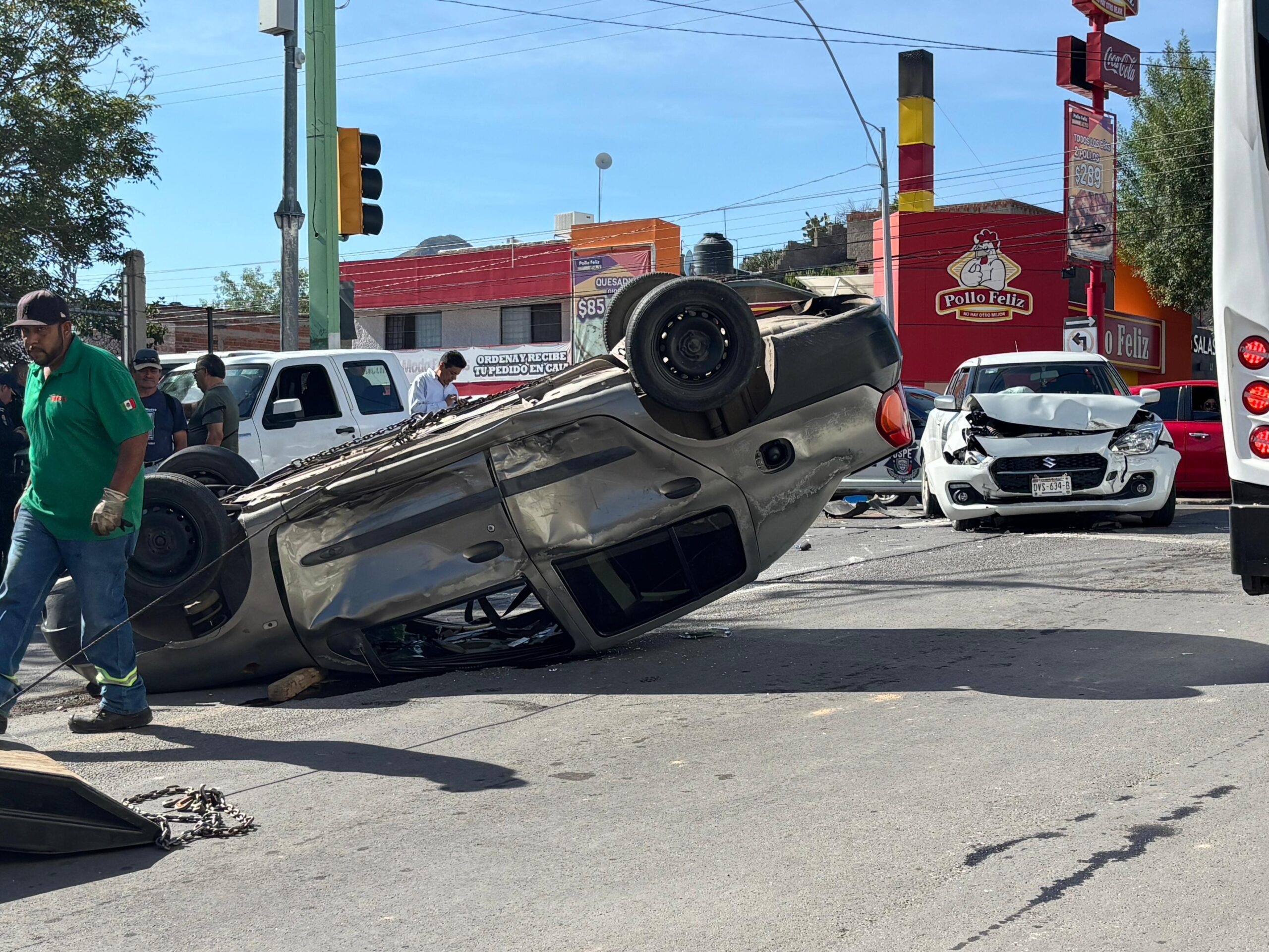 Chihuahua, Chih.- El conductor de un vehículo Suzuki Swift provocó un choque y volcadura en la avenida Independencia y la calle Tamborel por no respetar la luz roja del semáforo.