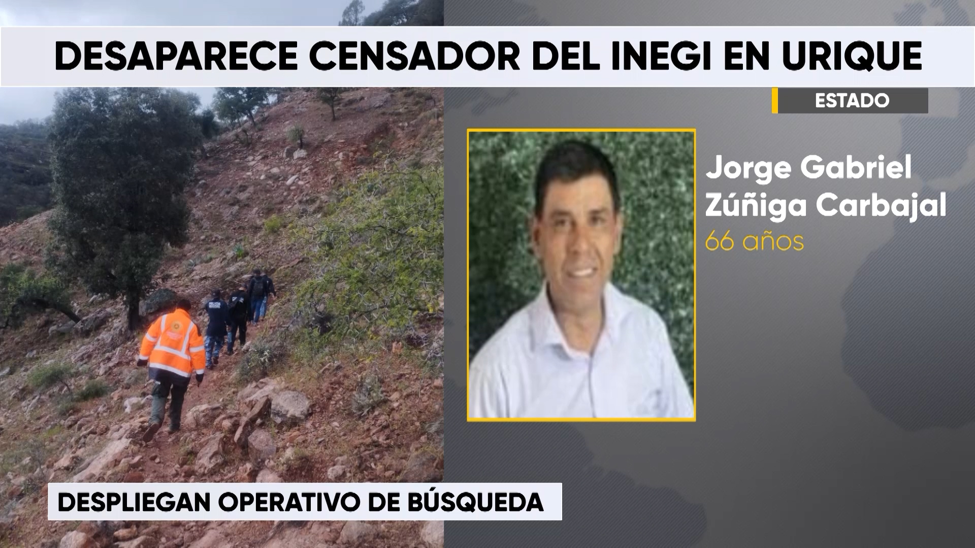 Chihuahua.- Una amplia operación de búsqueda se desplegó en la zona serrana del municipio de Urique para localizar al encuestador del Instituto Nacional de Estadística y Geografía (INEGI), Jorge Gabriel Zuñiga Carbajal, quien fue reportado como desaparecido desde el pasado 10 de octubre.