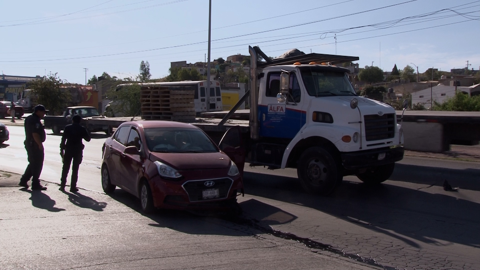 Chihuahua, Chih.- Una mujer de la tercera edad resultó lesionada tras un fuerte choque entre un automóvil Hyundai rojo y un camión de carga, ocurrido sobre la avenida Pacheco, casi en el cruce con Melchor Guaspe.