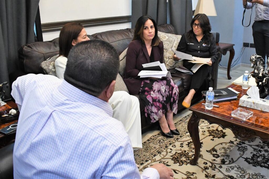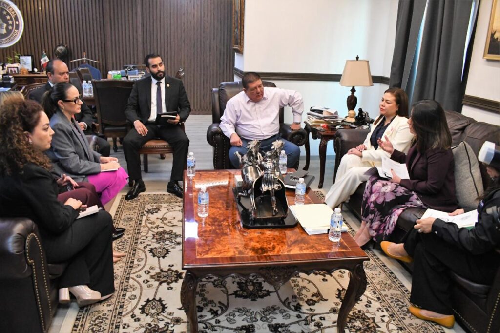 Chihuahua, Chih.- El fiscal general del Estado, César Jáuregui Moreno, recibió en su despacho a la magistrada presidenta del Tribunal Superior de Justicia, Marcela Herrera Sandoval, así como a los titulares de la Procuraduría de Niñas, Niños y Adolescentes, Omar Velázquez Ortega, y de la Dirección Jurídica de la Secretaría de Seguridad Pública Estatal, Omar Tinoco Torres.