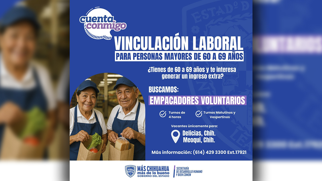 Chihuahua.- El Gobierno del Estado, a través de la Secretaría de Desarrollo Humano y Bien Común (SDHyBC) dio a conocer que se abrieron nuevas vacantes laborales dirigidas a personas de entre 60 y 69 años de edad, para integrarse como empacadores voluntarios en Delicias y Meoqui.