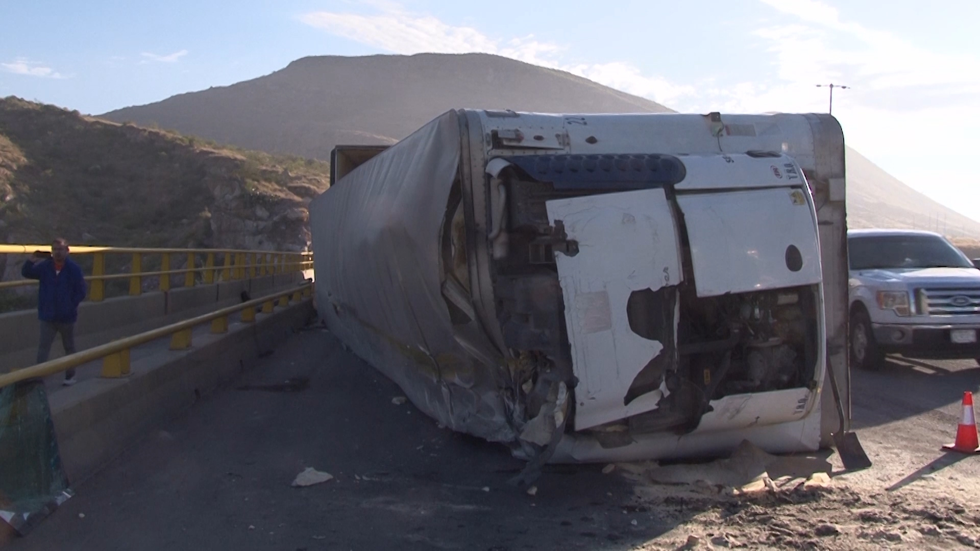 Tráiler con 26 toneladas de carne vuelca sobre la carretera Chihuahua-Aldama
