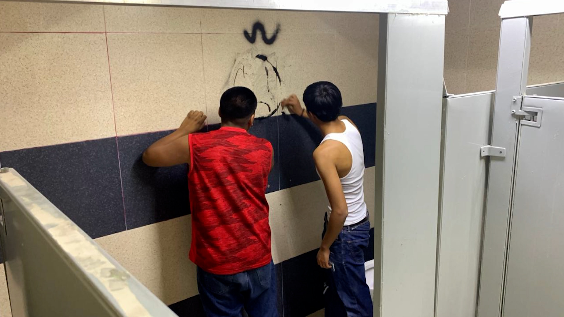 Chihuahua, Chih.- Dos jóvenes fueron detenidos tras vandalizar el interior de los baños del Polideportivo Luis H. Álvarez la noche del viernes.