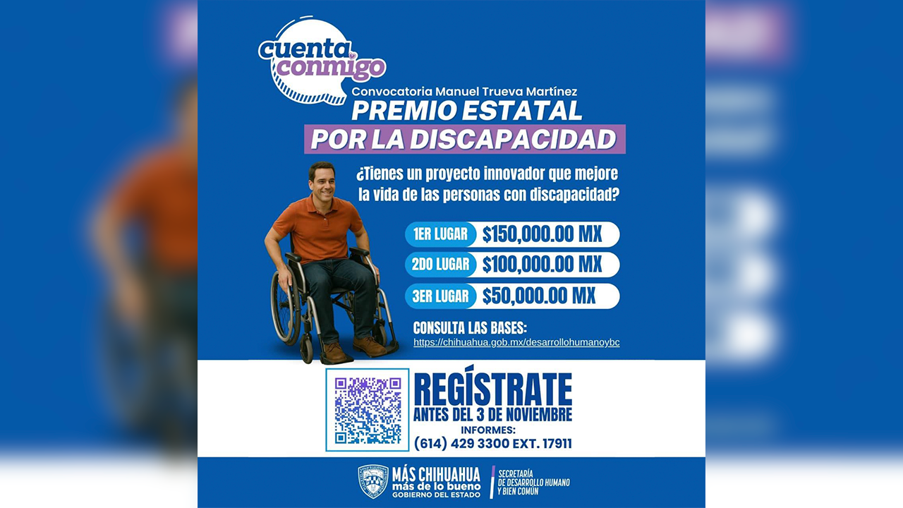 Chihuahua, Chih.- La Secretaría de Desarrollo Humano y Bien Común (SDHyBC) informó que este 3 de noviembre vence el plazo para la recepción de proyectos del Premio Estatal por la Discapacidad “Manuel Trueva Martínez 2025”.