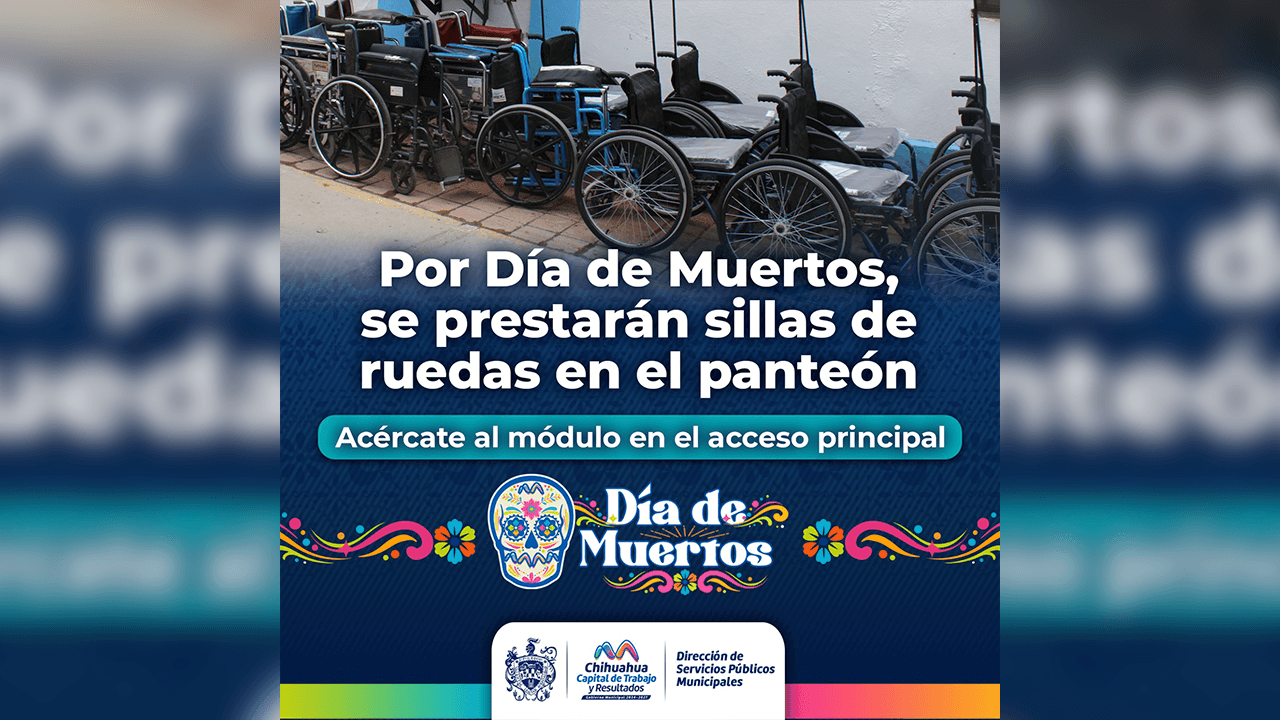 Chihuahua, Chih.- El Gobierno Municipal, a través de la Dirección de Servicios Públicos Municipales, informa a la población que se contará con el servicio de préstamo de sillas de ruedas en las instalaciones del Panteón Municipal 1, del viernes 31 de octubre al domingo 2 de noviembre.