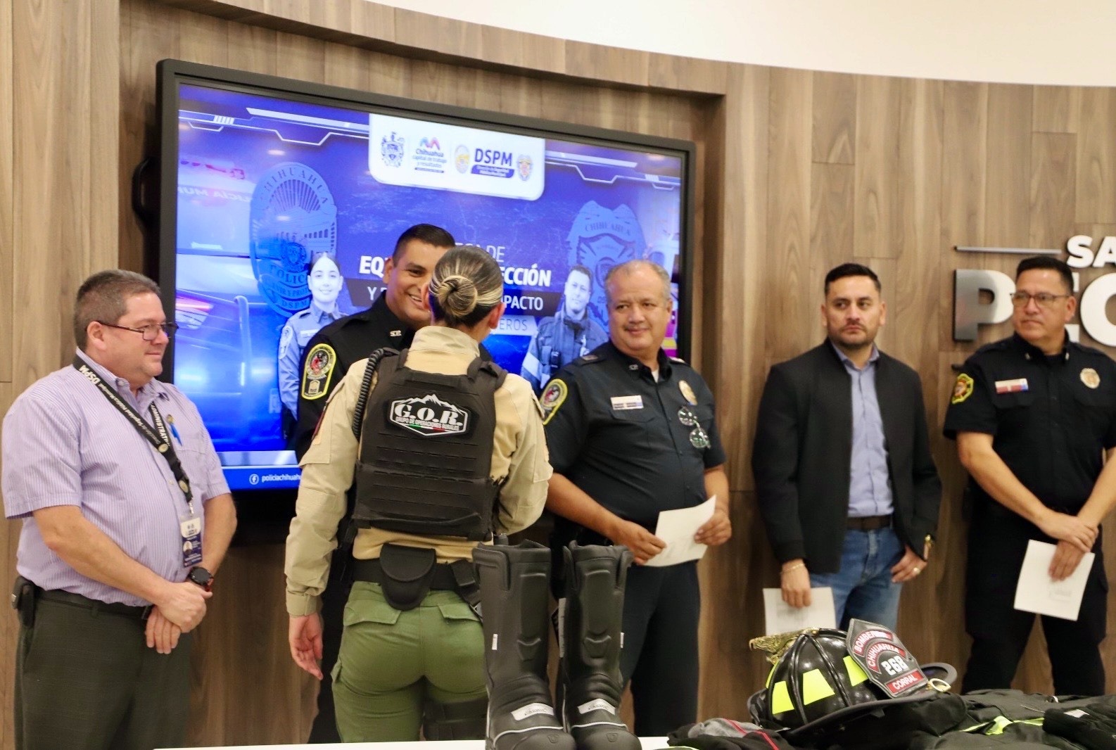 Chihuahua, Chih.- La Dirección de Seguridad Pública Municipal, entregó equipos de protección a 33 elementos del H. Cuerpo de Bomberos de la ciudad a fin de brindar las herramientas para seguridad de quienes a diario arriesgan su vida por las y los chihuahuenses.