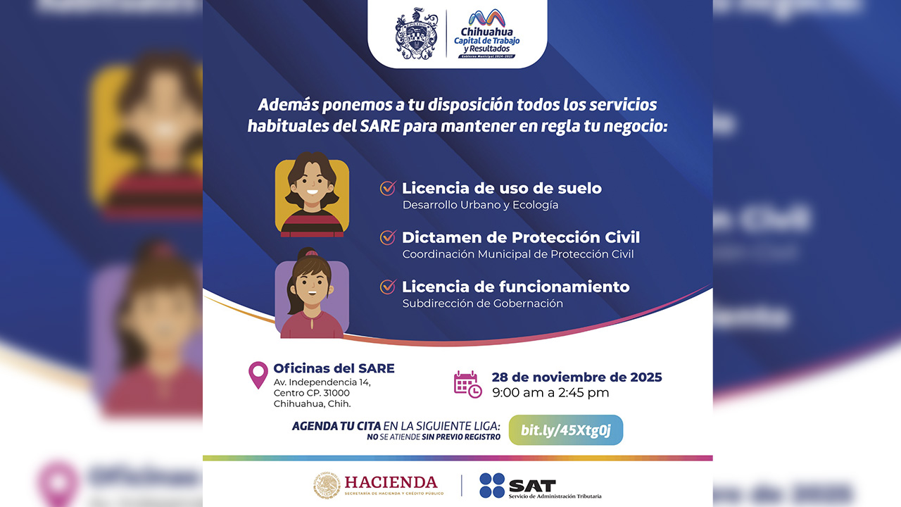 Chihuahua, Chih.- El Gobierno Municipal de Chihuahua, a través de la Dirección de Desarrollo Económico y Competitividad en colaboración con el Servicio de Administración Tributaria (SAT), informa a la población que el próximo viernes 28 de noviembre podrán realizar trámites fiscales y administrativos para personas físicas en las instalaciones del SARE.