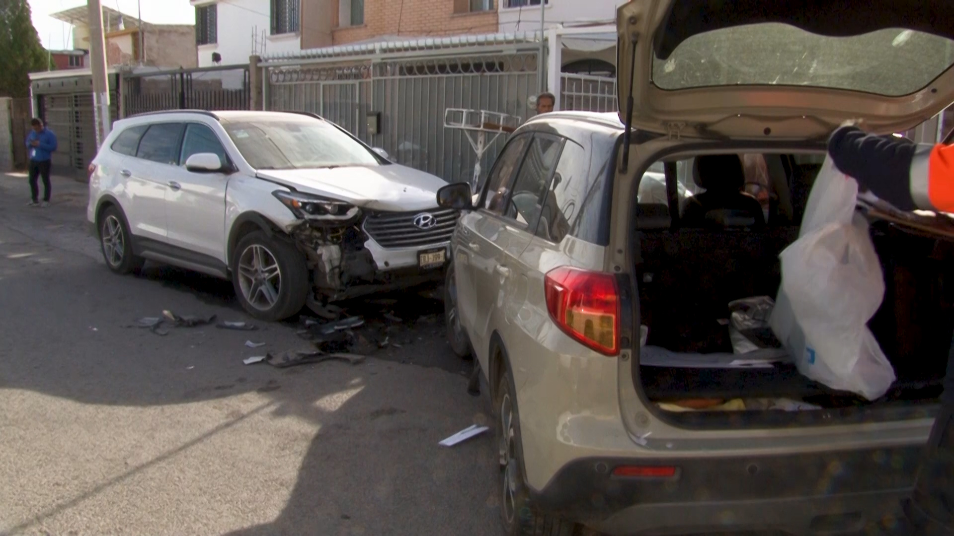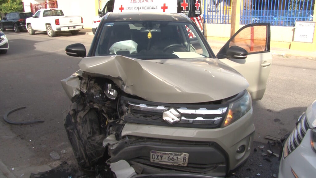 Chihuahua, Chih.- Un fuerte choque contra un vehículo estacionado dejó lesionada a una mujer de 43 años en el cruce de las calles Coyolxauhqui y Culhuacán, en la colonia Infonavit Nacional.