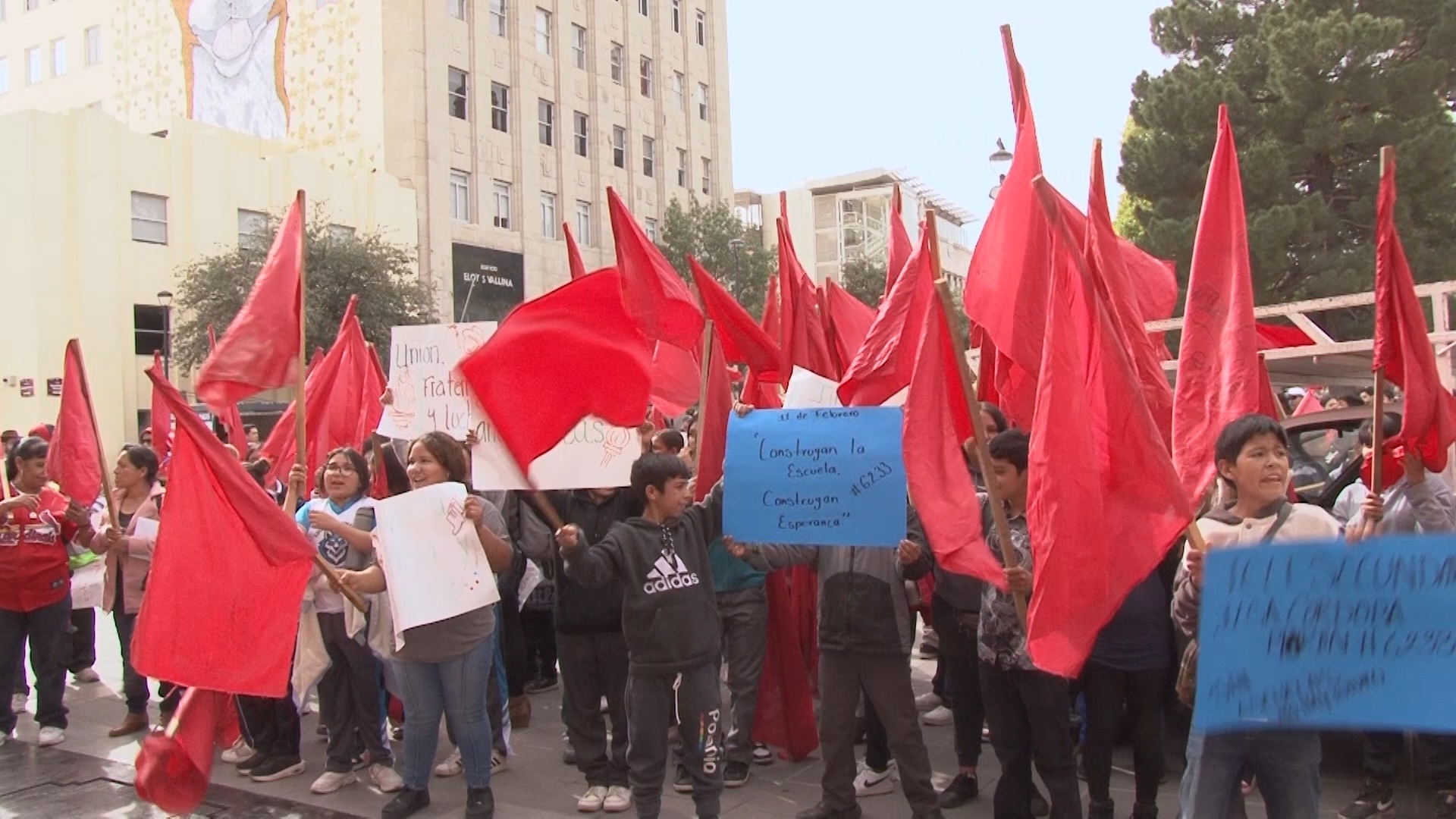 Chihuahua, Chih.- Docentes y alumnos de escuelas del suroriente de Chihuahua marcharon del Palacio de Gobierno a la Presidencia Municipal para exigir que sus planteles sean atendidos y considerados en el presupuesto del año 2026.