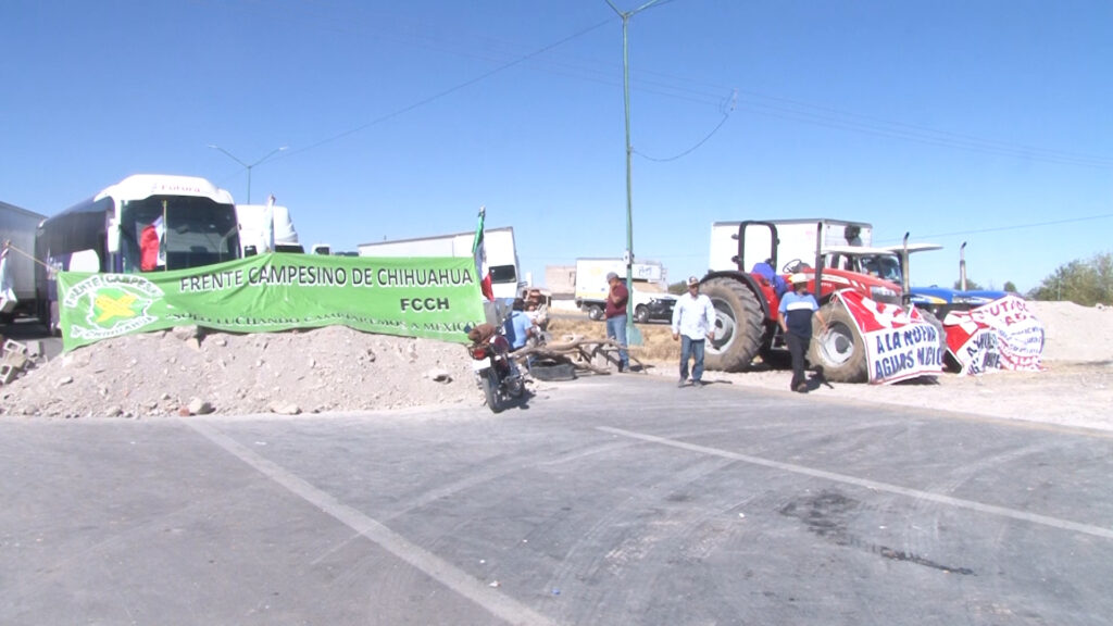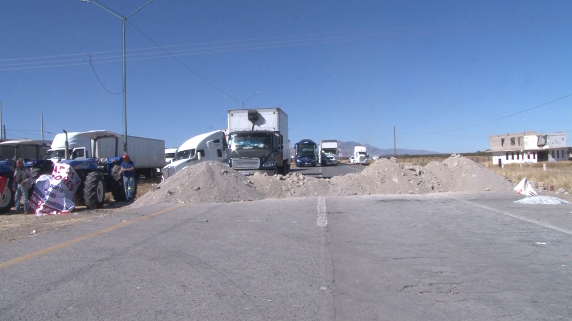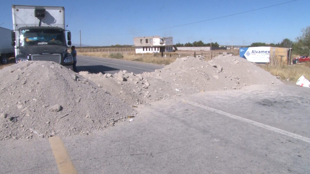 Meoqui.- Con dompes, los agricultores colocaron tierra y piedra para continuar con el bloqueo en la carretera 45, en el seccional de Lázaro Cárdenas, en Meoqui.