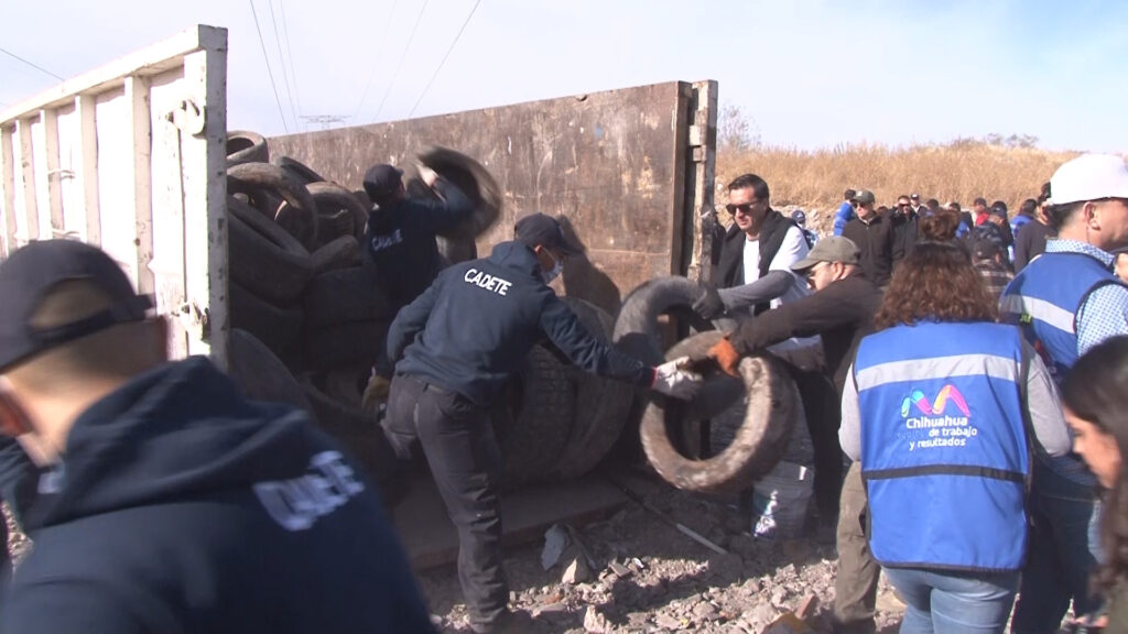 Cerca de 400 personas, incluyendo al alcalde de Chihuahua, Marco Bonilla Mendoza, retiraron escombro, maleza, llantas, basura e incluso muebles del lecho del río Sacramento.