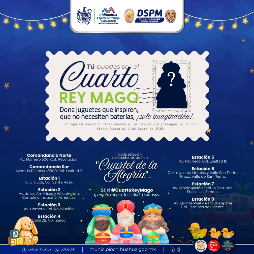 Chihuahua, Chih.- Elementos del H. Cuerpo de Bomberos y Rescate informaron que, a partir del 1 de diciembre, inició la colecta anual de juguetes bajo el lema “El Cuarto Rey Mago”, invitando a la ciudadanía a participar con la donación de juguetes que serán entregados a niñas y niños de zonas vulnerables.
