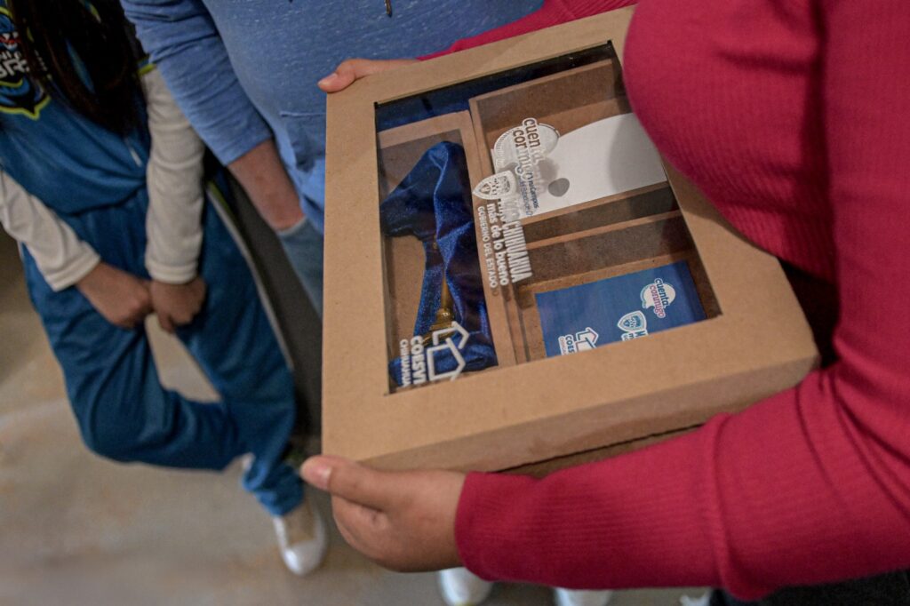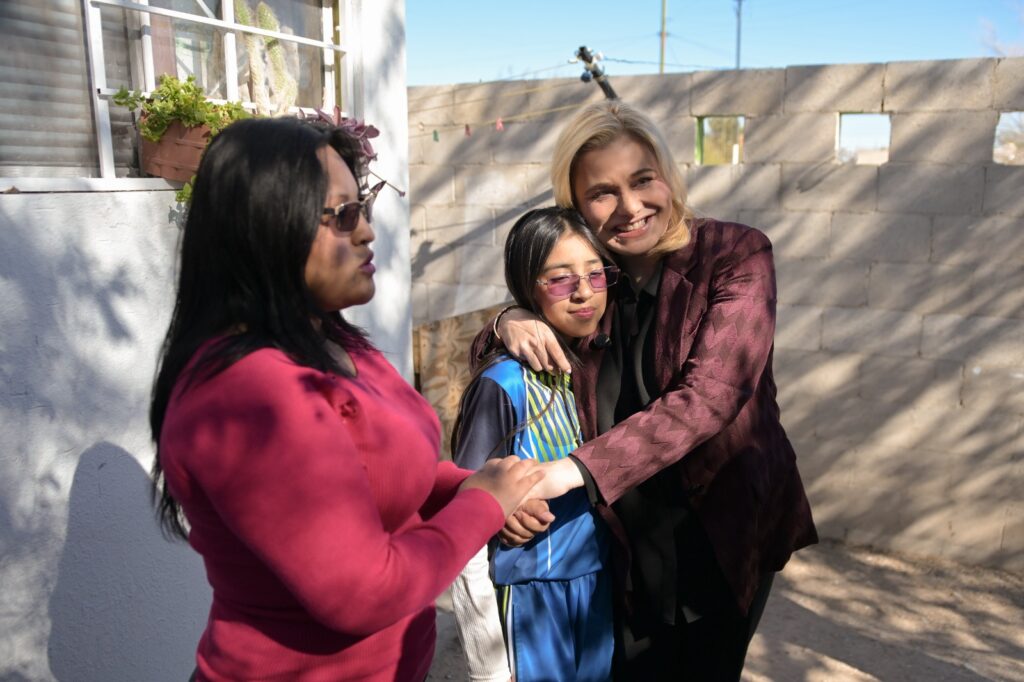 Juárez, Chih.- La gobernadora del estado, María Eugenia Campos Galván, entregó a la ciudadana Liliana Vanessa Gallegos y a su familia el documento de comodato, que les da certidumbre jurídica sobre la vivienda en que residen.