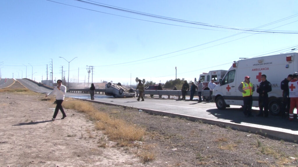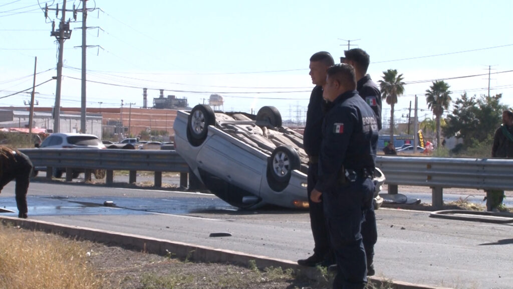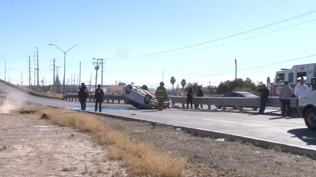 Delicias, Chih.- Un conductor de 23 años volcó su vehículo en el kilómetro 135 de la carretera 45, a la altura del puente de Cielo Vista, frente al fraccionamiento del mismo nombre, en un sentido de Delicias a Saucillo, la tarde de este lunes.