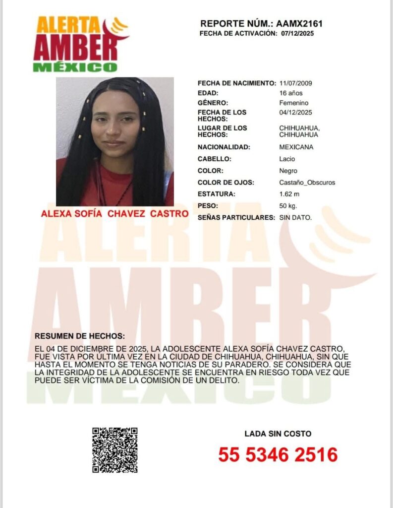 Chihuahua, Chih.- Se solicita la ayuda de la ciudadanía para localizar a Alexa Sofía Chavez Castro, quien fue vista por última vez el pasado 04 de diciembre del 2025 en Chihuahua, Chihuahua.