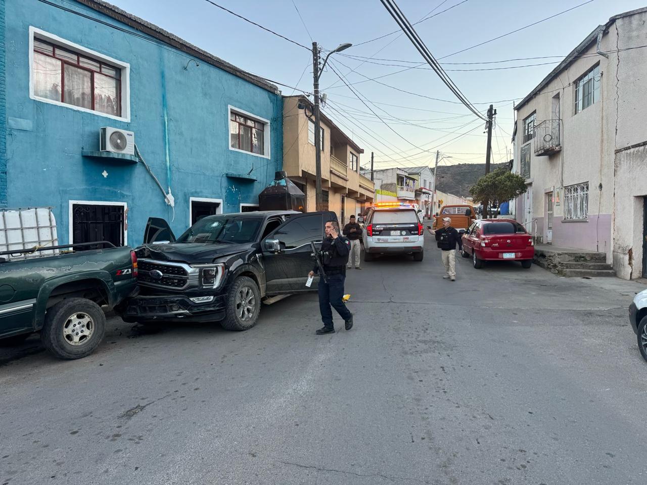 Al arribar a la zona centro de San Francisco dem Oro, los policías estatales localizaron un vehículo Ford F-150, color negro, el cual contaba con blindaje y presentaba múltiples impactos de arma de fuego visibles.