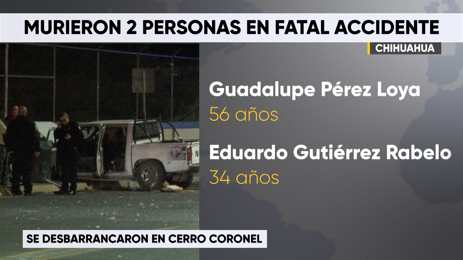 Chihuahua, Chih.- Dos personas, identificadas como José Guadalupe Pérez Loya, de 56 años, y Eduardo Gutiérrez Rabelo, de 34 años, fallecieron tras desbarrancarse a bordo de una pickup desde lo alto del Cerro Coronel, en la intersección de la avenida 20 de Noviembre y calle 51, la tarde-noche del domingo.