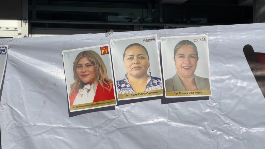 Durante la protesta, señalaron a los diputados que votaron a favor del paquete económico y exigieron la renuncia de Rosana Díaz, Edith Palma e Irlanda Márquez, diputadas de la 4T que se ausentaron durante la sesión en la que se discutió el tema.