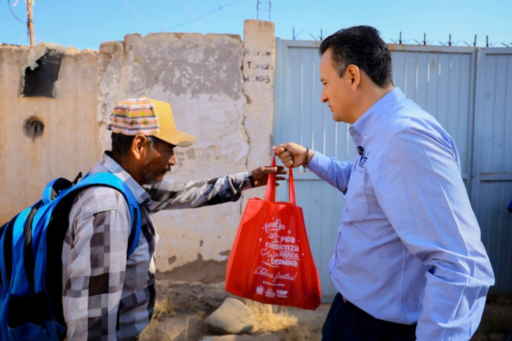Chihuahua, Chih.- El alcalde de Chihuahua, Marco Antonio Bonilla, y su esposa, Karina Olivas, entregaron cenas navideñas a familias de la colonia Crucero, al sur de la ciudad.