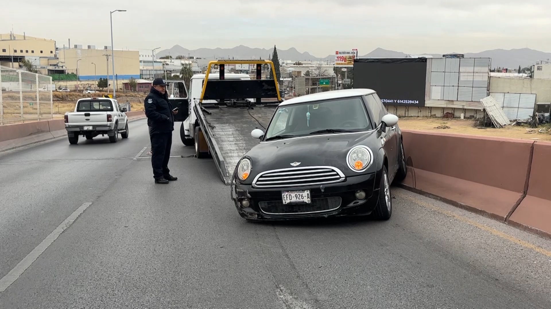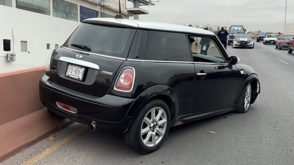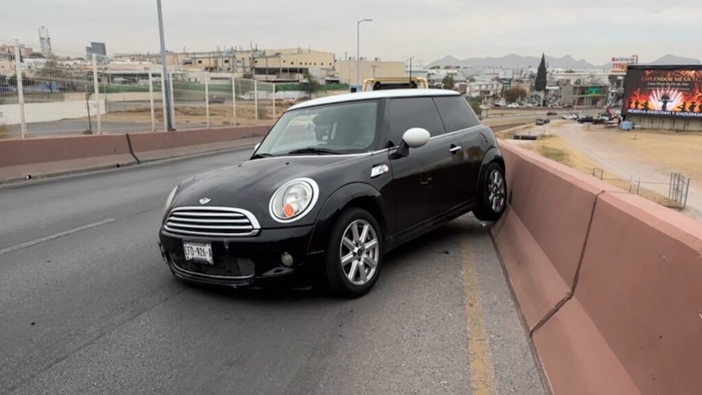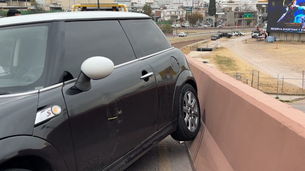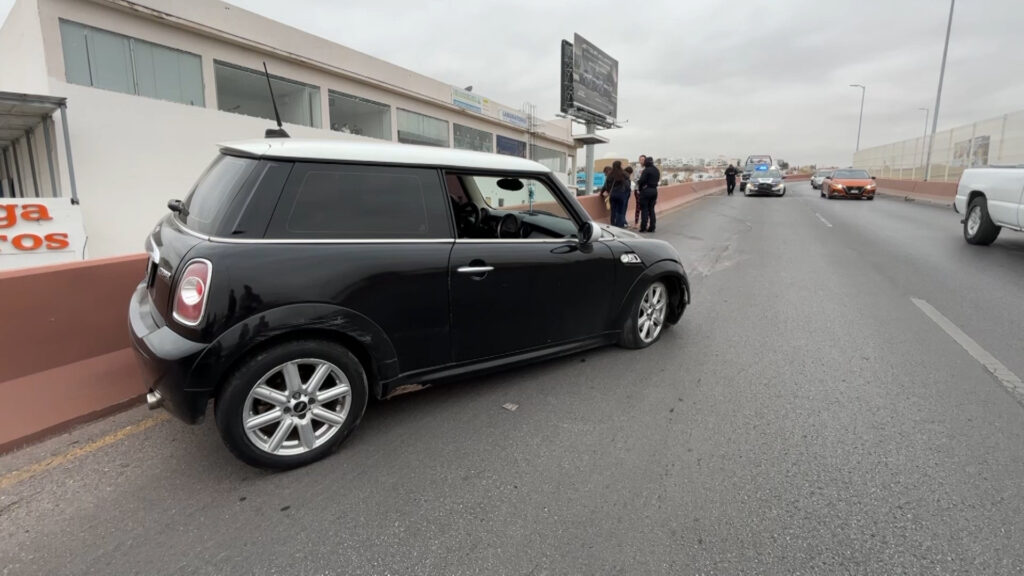 Chihuahua, Chih.- Una conductora impactó un vehículo Mini Cooper contra el muro de contención de la gaza de integración del periférico de la Juventud a la avenida de la Cantera, tras circular a exceso de velocidad al momento de ingresar a la curva y perder el control del volante.