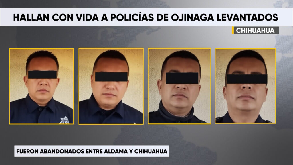Chihuahua.- Los cuatro elementos de la Policía Municipal de Ojinaga que fueron privados de la libertad por sujetos armados el pasado lunes fueron localizados con vida en un lote campestre ubicado entre los municipios de Aldama y Ojinaga. Los oficiales fueron identificados como Juan Carlos Vázquez Rivera, José Luis Cortez Ortiz, el comandante Miguel Ángel Núñez Chávez y el director interino de la Policía Municipal, Ramiro Orozco Pineda.
