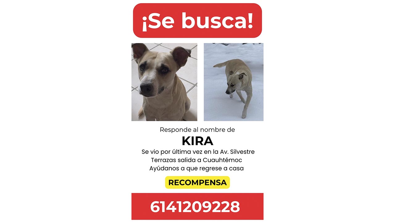 Chihuahua, Chih.- Se perdió el pasado 24 de diciembre en la colonia Martín López / Ramón Reyes (salida a Cuauhtémoc) tras asustarse por la pirotecnia.