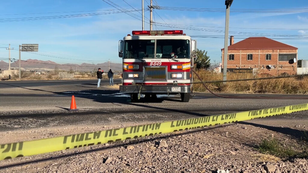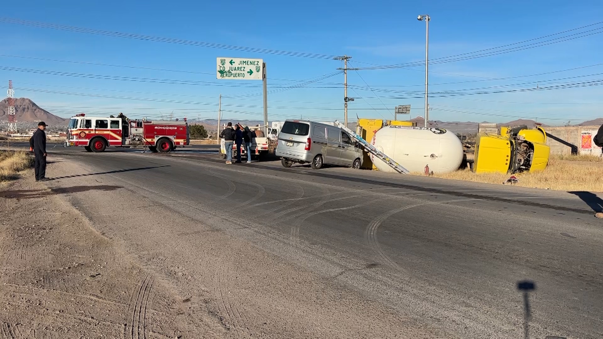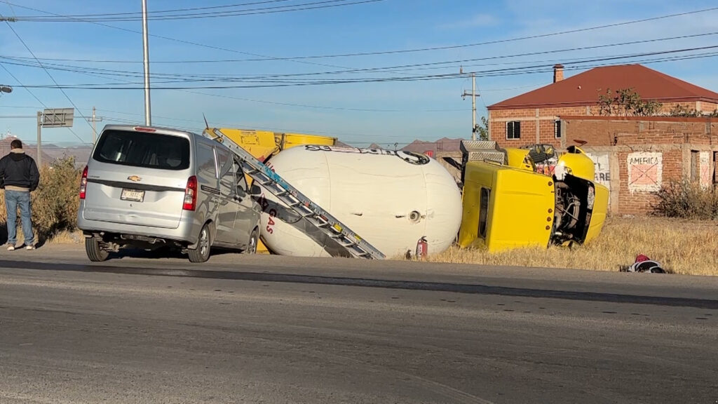 Chihuahua, Chih.- Una pipa que transportaba gas lp volcó luego de chocar con una camioneta Chevrolet Tornado, hechos ocurridos en la prolongación Lombardo Toledano, a la altura del entronque que conduce al Cereso de Aquiles Serdán, sin que se reportaran personas lesionadas.