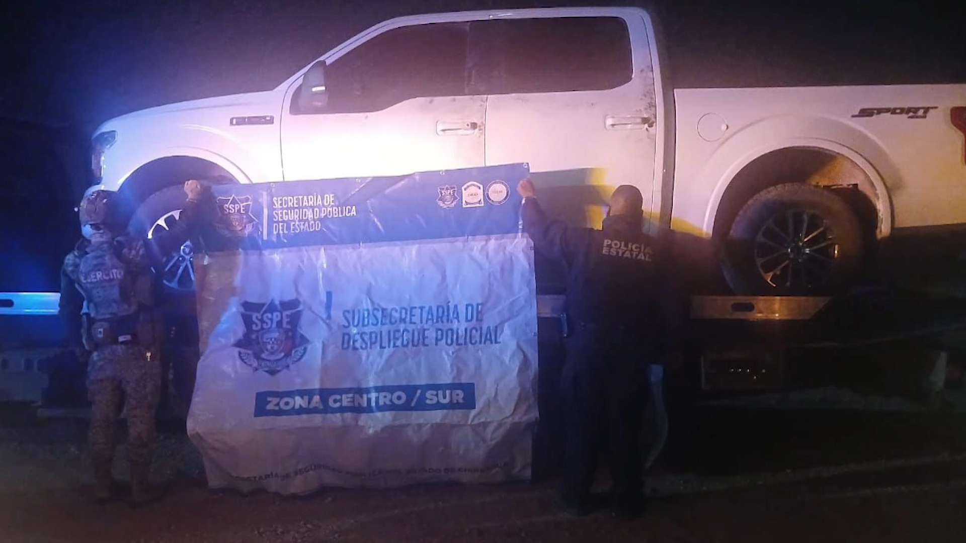 Al realizar la inspección correspondiente, los agentes se percataron de que el vehículo, una pick up Ford de color blanco, presentaba impactos de arma de fuego, situación que derivó en un rastreo exhaustivo en la zona.