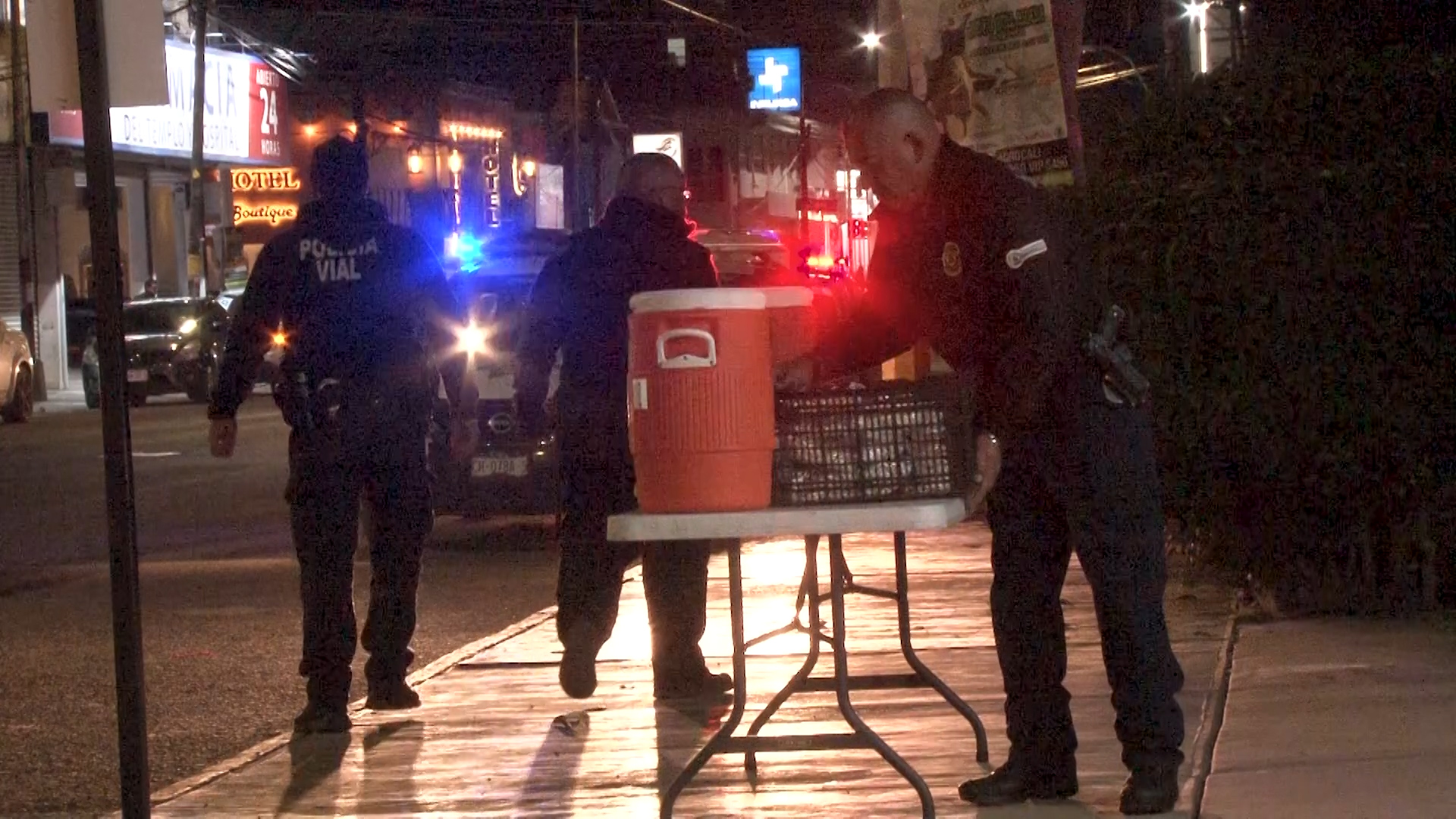 Cuauhtémoc, Chih.- Elementos de seguridad pública y vialidad de Cuauhtémoc compartieron alimentos con familiares que permanecían en vigilia afuera del hospital Ramírez Topete.