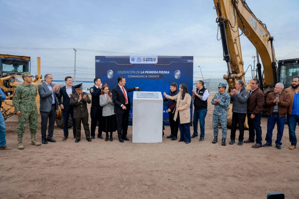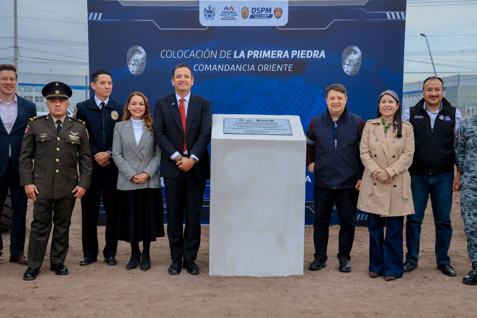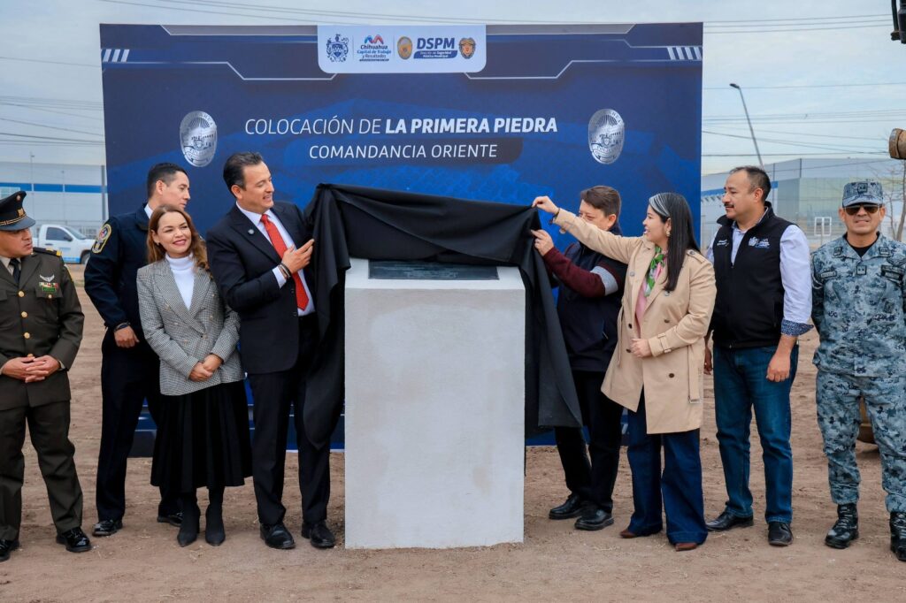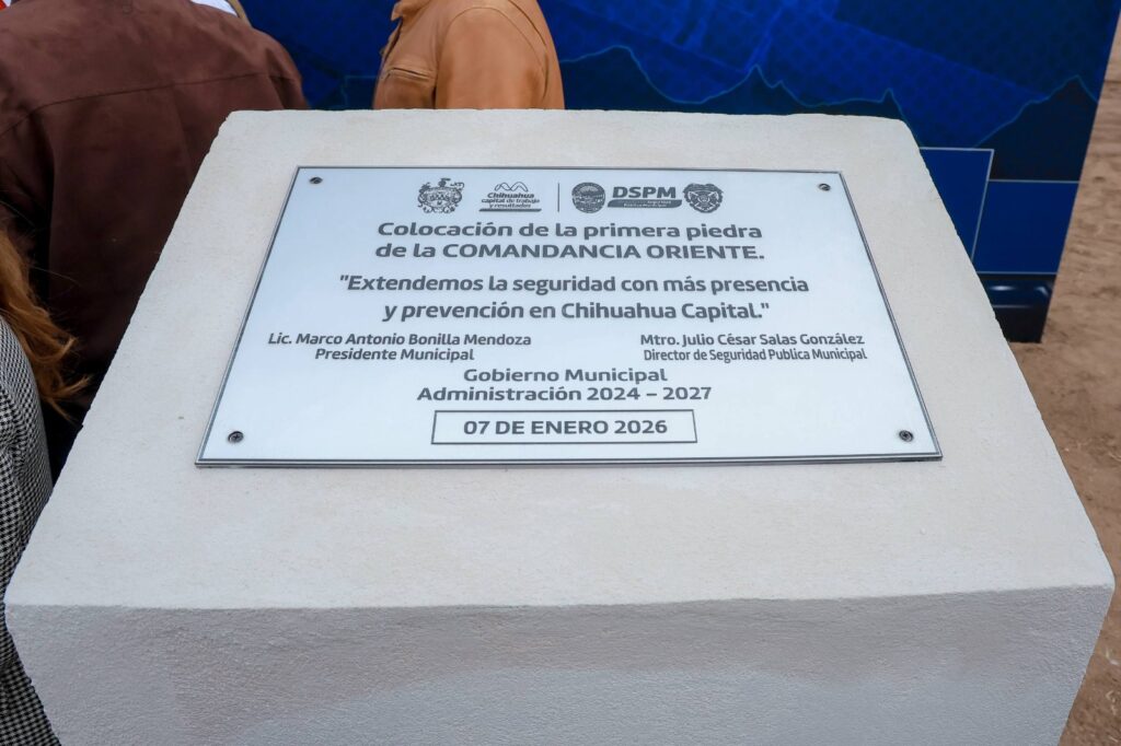 Chihuahua, Chih.- El alcalde Marco Bonilla, junto con el director de Seguridad Pública Municipal, Julio Salas, encabezó la colocación de la primera piedra de la nueva Comandancia de Policía en la zona Oriente, con el objetivo de mejorar los tiempos de respuesta ante emergencias y fortalecer de manera permanente y estratégica la presencia policial.