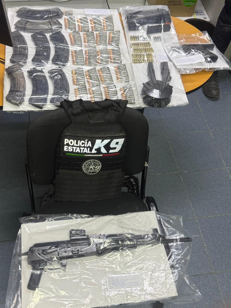 De manera posterior, se desplegó personal del grupo K9, lo que permitió que uno de los ejemplares caninos, de nombre Acre, localizara otra arma de fuego en un terreno baldío aledaño, zona por la que presuntamente huyeron los demás ocupantes del vehículo.