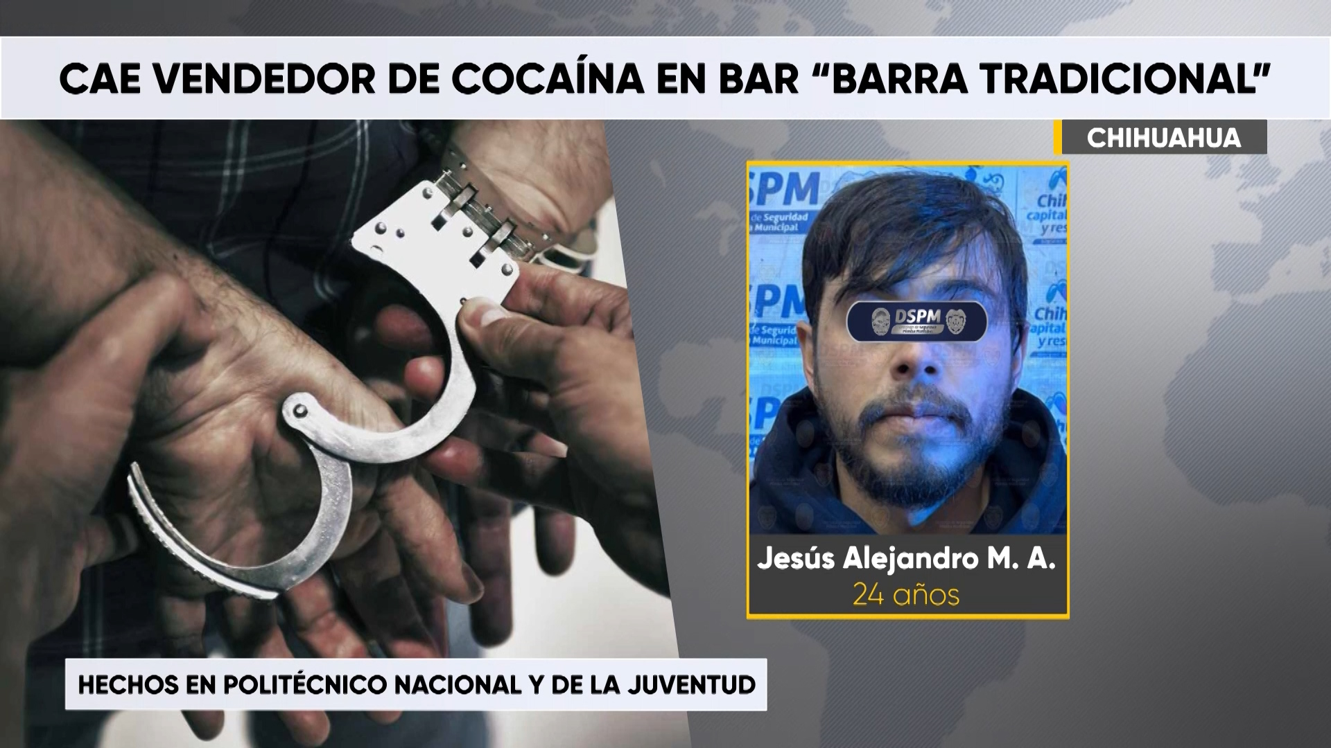 Chihuahua, Chih.- Un joven de 24 años, identificado como Jesús Alejandro M. A., fue detenido con varias porciones de cocaína en el interior del bar La Barra Tradicional, ubicado en Avenida Politécnico Nacional y Fuente del Agua Feliz.