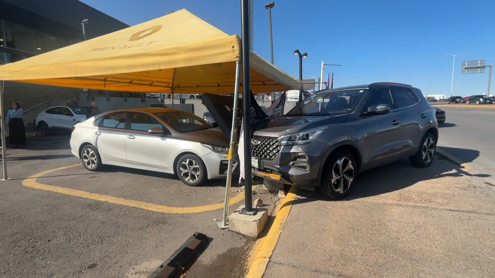 Los hechos ocurrieron cuando el responsable salía del estacionamiento de la agencia en su camioneta Chirey Tiggo 4 Pro. Debido al alto flujo de vehículos en el periférico, el conductor aceleró rápidamente para incorporarse, perdió el control del volante y terminó subiendo a la banqueta, donde impactó y derribó la estructura sobre un Kia Forte.