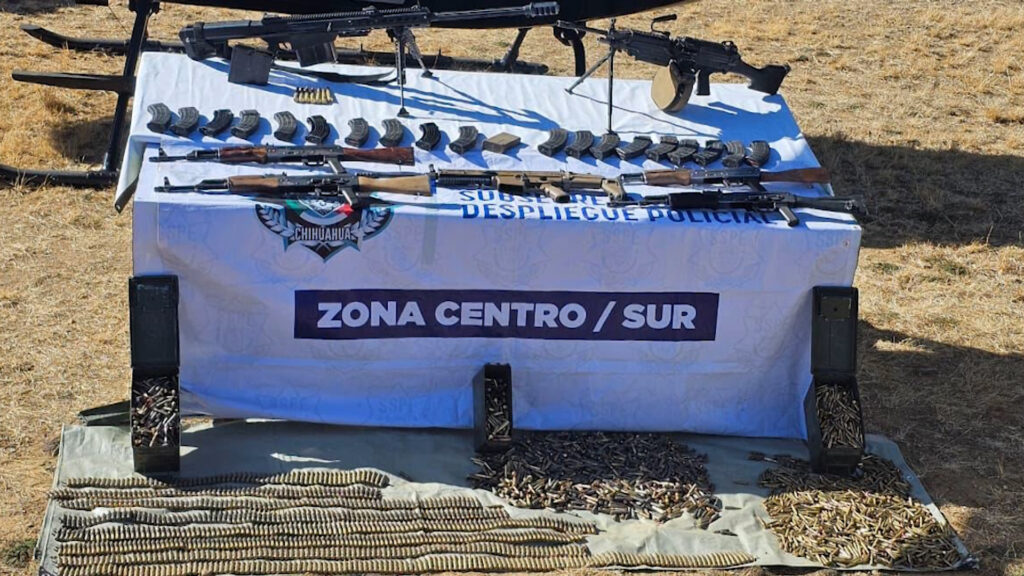 Guachochi, Chih.- La Secretaría de Seguridad Pública, en coordinación con la Guardia Nacional y el Ejército Mexicano, aseguró un arsenal y dos vehículos presuntamente vinculados al crimen organizado tras un enfrentamiento armado registrado la tarde del sábado en el municipio de Guachochi.