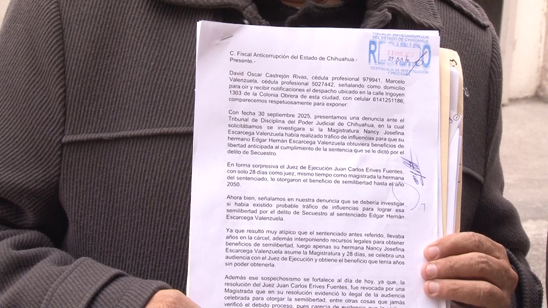Chihuahua, Chih.- Los abogados Oscar Castrejón y Marcelo Valenzuela presentaron una denuncia formal ante la Fiscalía Anticorrupción para que se investigue a la magistrada Nancy Josefina Escárcega Valenzuela, acusada de un presunto caso de tráfico de influencias a favor de su propio hermano.