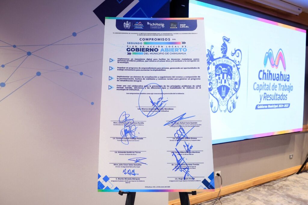 Chihuahua, Chih.- El alcalde Marco Bonilla y diversas dependencias del Gobierno Municipal firmaron los compromisos del Segundo Plan de Gobierno Abierto, que integrará las estrategias para atender los retos establecidos conjuntamente por gobierno y sociedad, con el objetivo de dar solución a problemas públicos.
