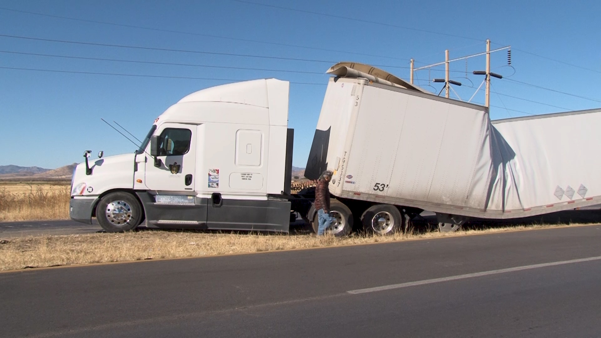 Estado.- Un tráiler que transportaba nuez terminó con la caja de carga doblada cuando su conductor intentó desviar el vehículo hacia el camellón central, en el kilómetro 39 de la carretera Juárez–Chihuahua, tras ser dirigido a ese punto durante un operativo derivado del incendio de una madrina que transportaba cinco vehículos.
