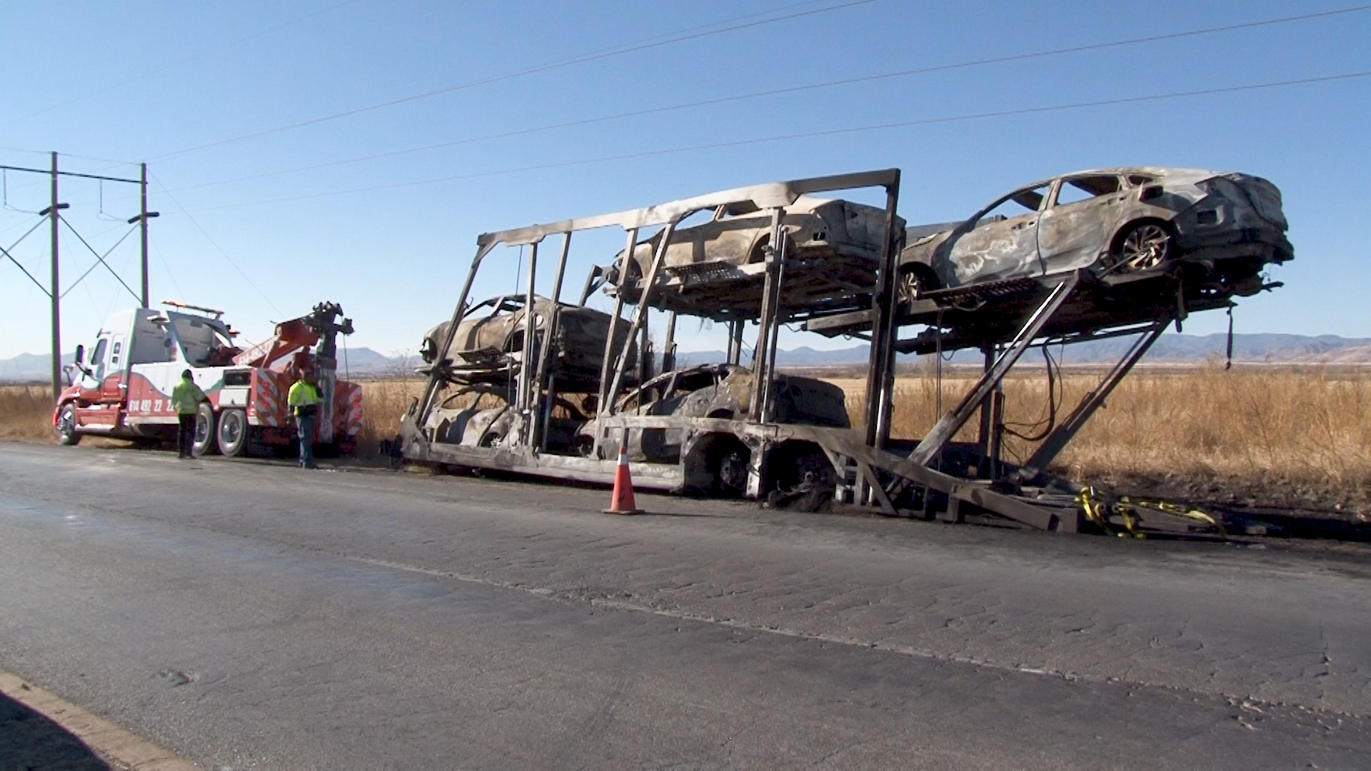 La unidad terminó completamente consumida por las llamas, lo que provocó la pérdida total de los cinco automóviles, los cuales tenían como destino la ciudad de Chihuahua.