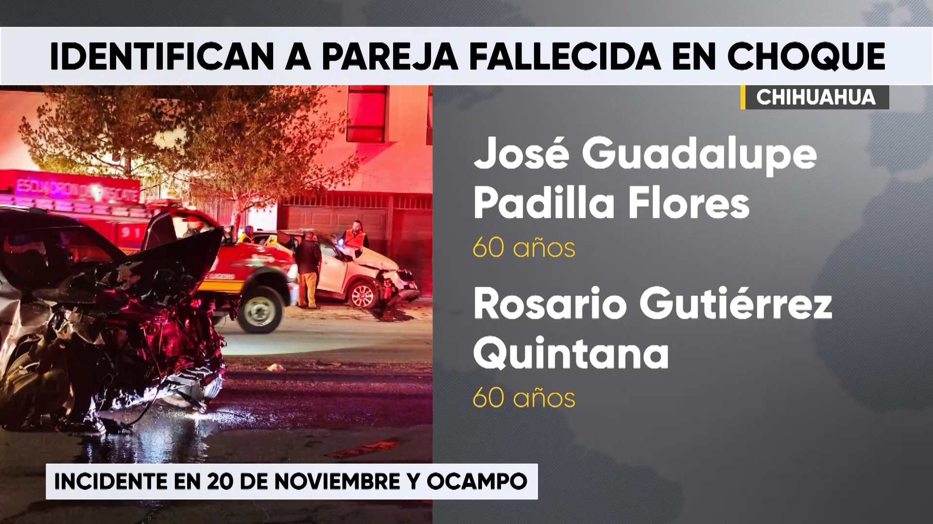 Chihuahua, Chih.- José Guadalupe Padilla Flores y Rosario Gutiérrez Quintana fueron identificados como las dos personas que perdieron la vida durante la madrugada del pasado domingo en un trágico accidente vial ocurrido en el cruce de la avenida 20 de Noviembre y Ocampo.