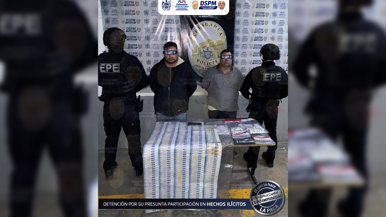 Chihuahua, Chih.- En la colonia Rosario, policías municipales detuvieron a dos hombres por la supuesta posesión de 51 porciones de un polvo blanco de apariencia similar a la cocaína, contenidas en pequeñas bolsas de hule, así como más de 100 mil pesos en efectivo que fueron asegurados en el momento.