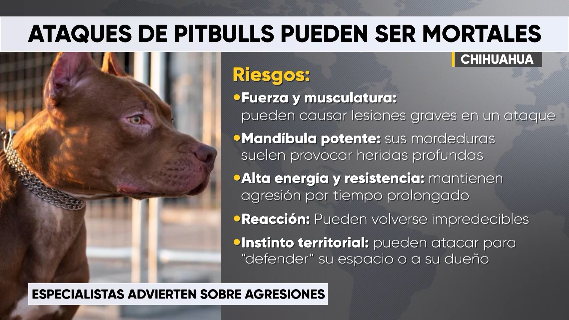 Chihuahua, Chih.- Especialistas en comportamiento canino advierten que los ataques de perros pitbull pueden resultar mortales debido a su fuerza y musculatura elevada, así como a la potencia de su mandíbula, capaz de provocar heridas profundas.