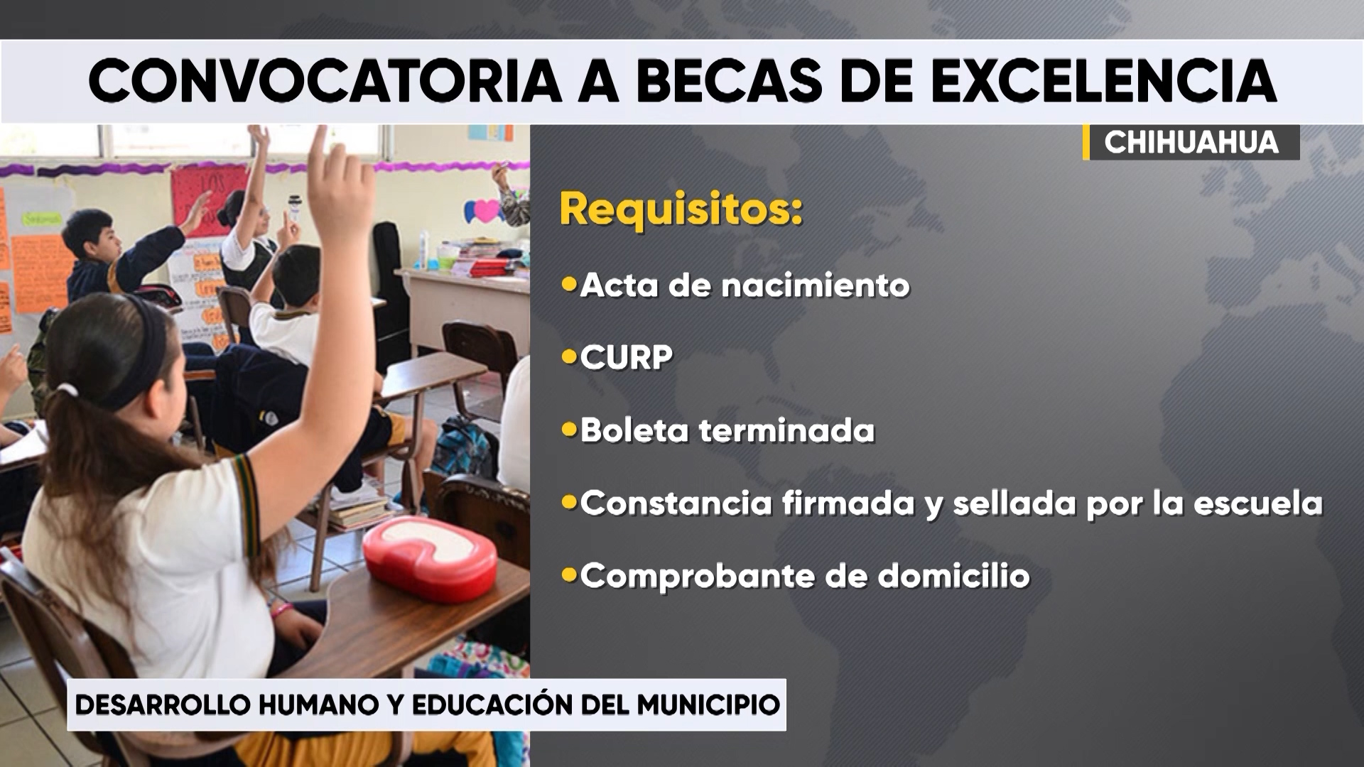 Chihuahua, Chih.- Los requisitos para solicitar una beca por excelencia académica por parte del Gobierno Municipal son: acta de nacimiento, CURP vigente, boleta terminada, constancia firmada y sellada por la institución educativa, así como un comprobante de domicilio, ya sea recibo de agua o de luz.
