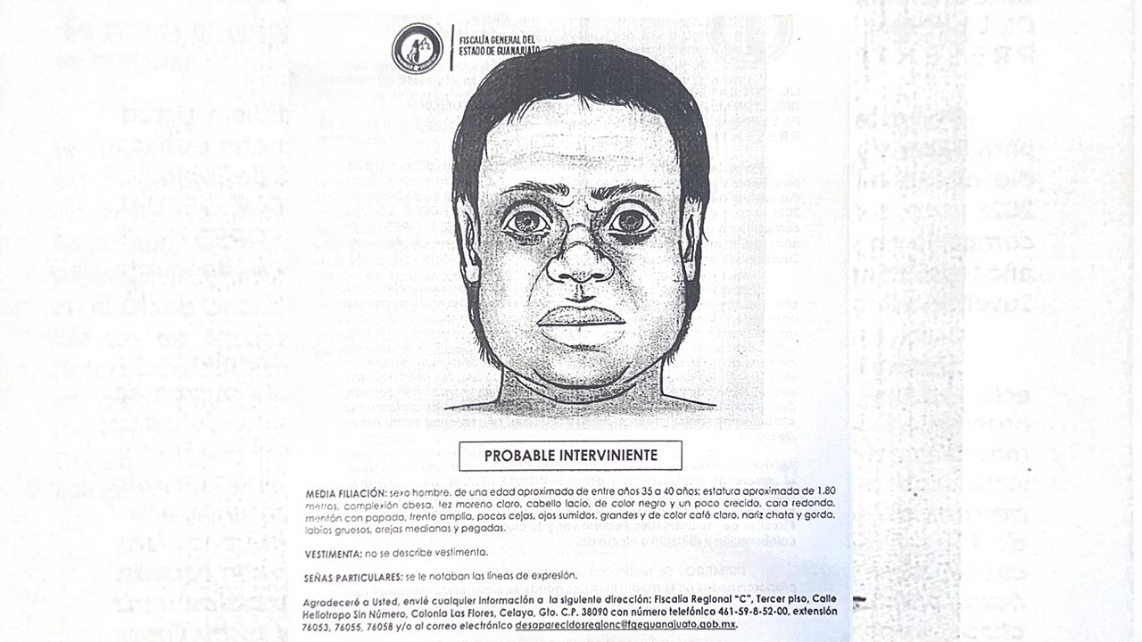De acuerdo con el retrato elaborado por peritos de la Fiscalía Especializada en Investigación de los Delitos cometidos en contra de las Mujeres por Razones de Género en el Estado de Guanajuato, el individuo de edad aproximada de 35 a 40 años, tiene las siguientes características:
