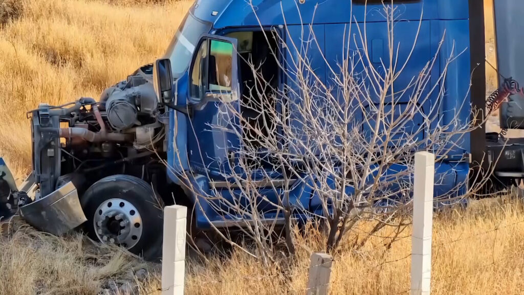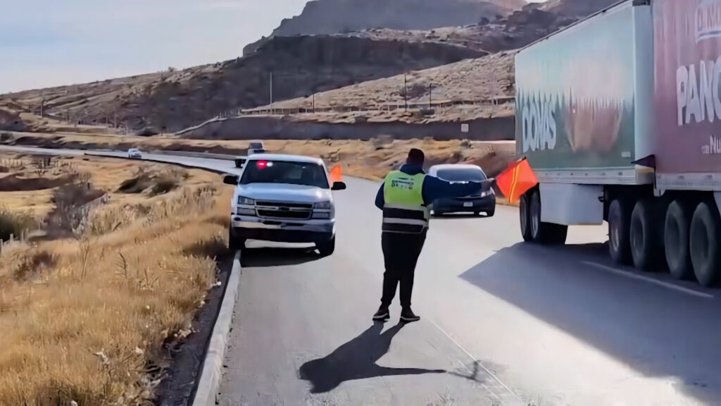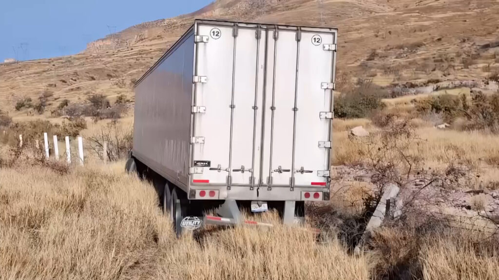 El tráiler, que cargaba una caja fría con artículos congelados, impactó y reventó las púas de un guardaganado situado en el desnivel, además de correr el riesgo de volcar.