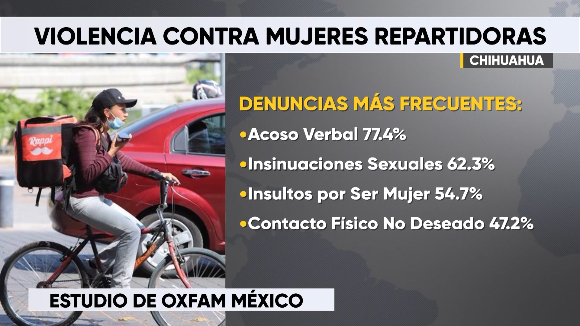 Chihuahua, Chih.- Según una encuesta realizada por Oxfam México, las agresiones más comunes hacia conductoras y repartidoras de plataformas son el acoso verbal, con un 77.4 por ciento; las insinuaciones sexuales, con un 62.3 por ciento; los insultos por ser mujer, con un 54.7 por ciento, y el contacto físico no deseado, con un 47.2 por ciento.