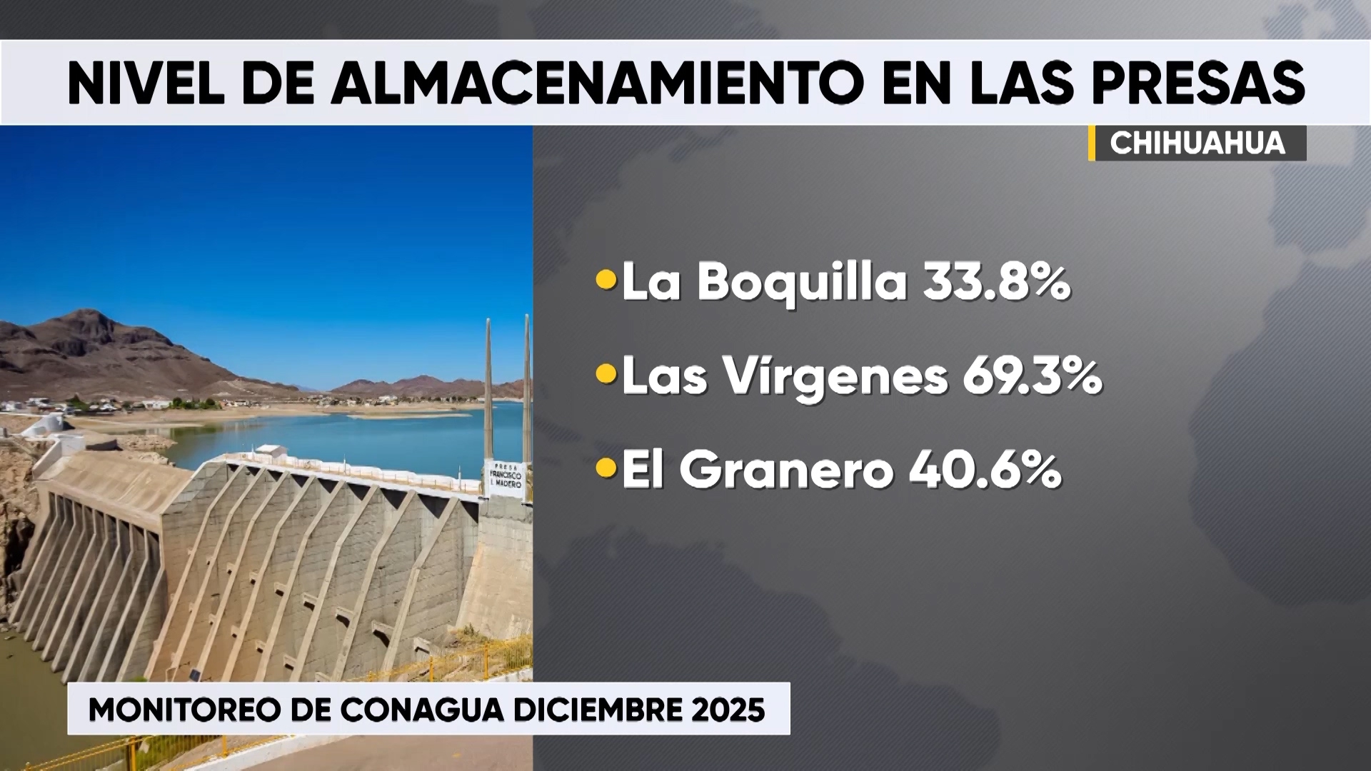 Chihuahua.- La Comisión Nacional del Agua (Conagua) informó sobre el nivel de almacenamiento de las diversas presas del estado: