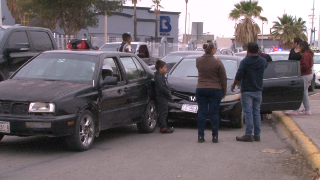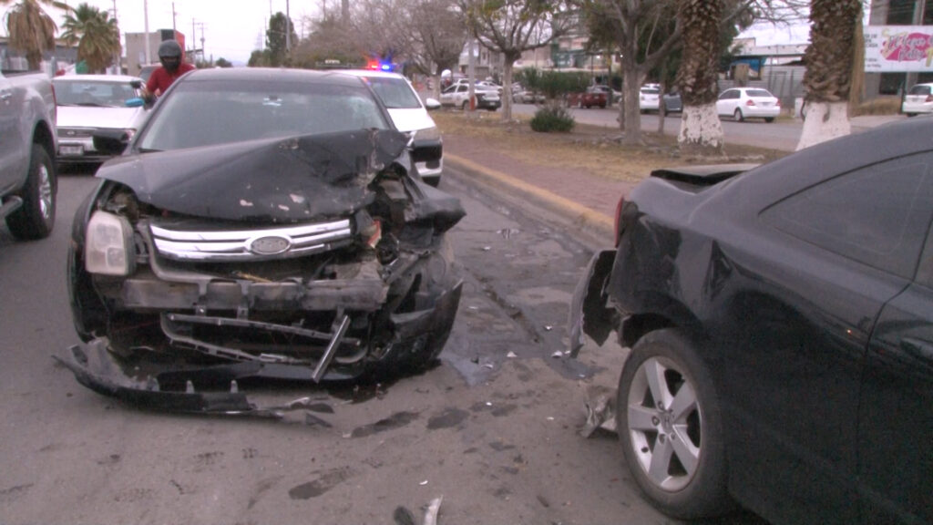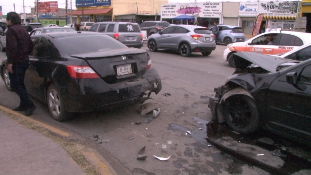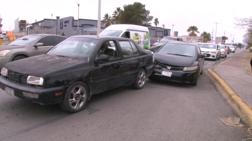 Delicias, Chih.- Un choque múltiple entre cinco vehículos se registró la tarde del lunes en la avenida Fernando Baeza, entre las avenidas Cuarta y Sexta Sur, en sentido de poniente a oriente, en la colonia Primero de Mayo.