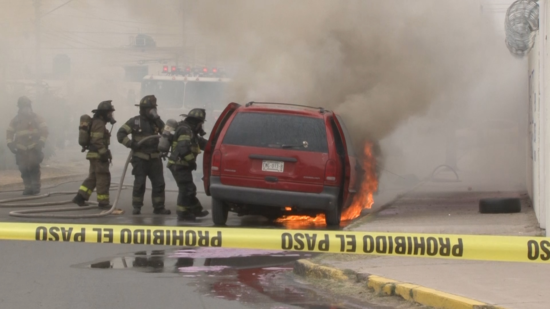 Chihuahua, Chih.- Una camioneta Dodge Caravan, de modelo atrasado, fue consumida parcialmente por el fuego tras registrarse una aparente falla mecánica, lo que movilizó a los cuerpos de emergencia.