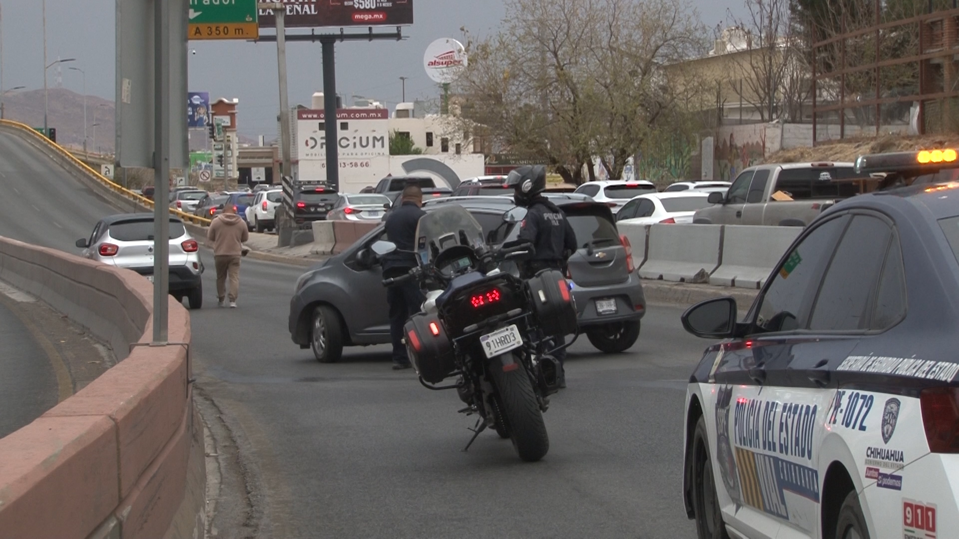 Chihuahua, Chih.- Un choque vehicular se registró en la avenida de la Cantera, en el cruce con la calle Washington, en el punto conocido como “la curva de los choques”, donde dos vehículos se vieron involucrados en un percance que no dejó personas lesionadas.